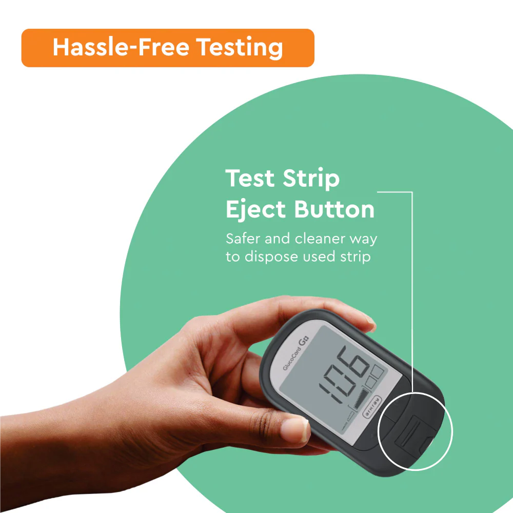 ARKRAY Glucocard G+ Blood glucose monitor strips need only a tiny drop of blood. With functions such as auto coding, before and after meal result flagging, result level indicator and test strip safe eject button, ARKRAY GLUCOCARD G+ makes life easy.